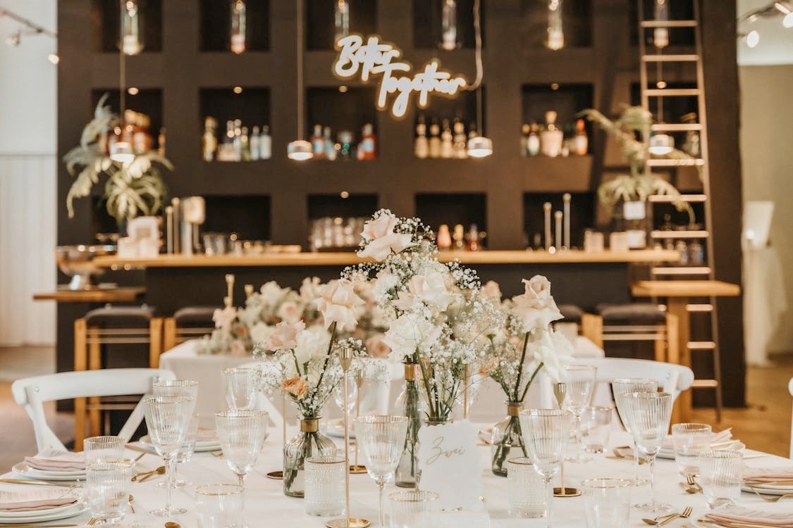 • Modern Elegance. For sophisticated affairs, create a sleek setup with monochromatic blooms in glass vases accented with metallic details. Choose roses, calla lilies, or orchids in coordinating shades for contemporary appeal.